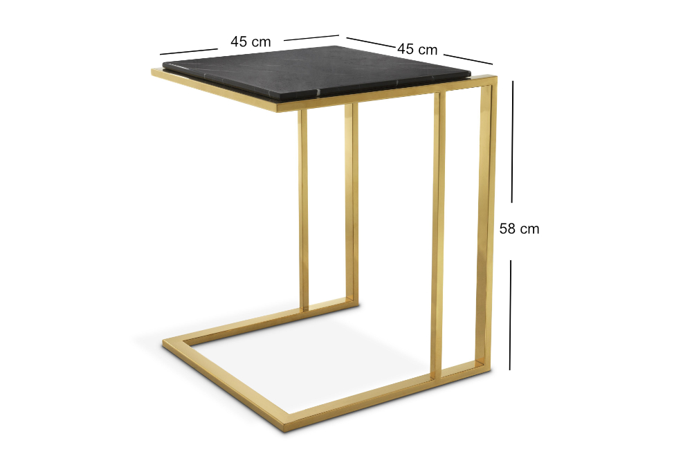 Das Gestell besteht aus poliertem goldfarbenen Edelstahl, die Tischplatte aus schwarzem Marmor.