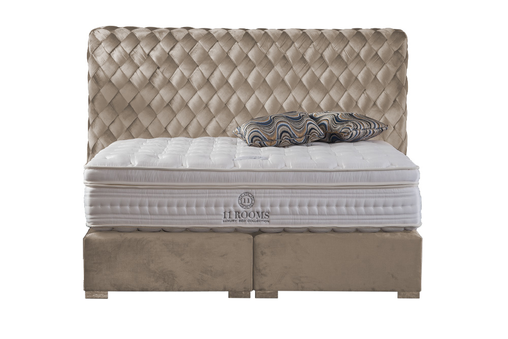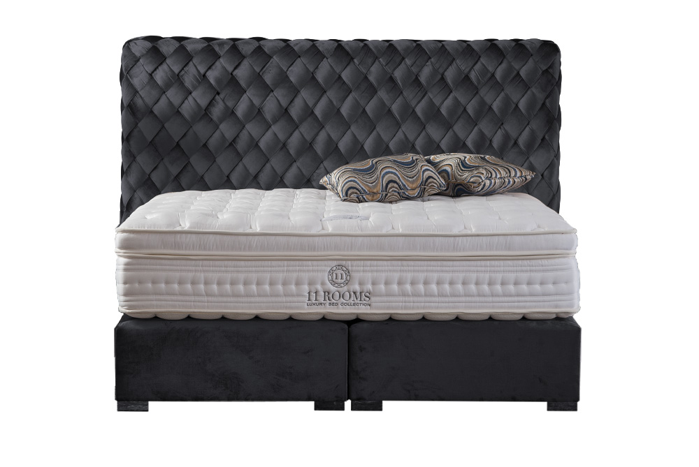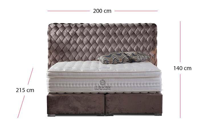 Das Boxspringbett King Mini erhält sein besonders edles Design durch das von Hand geflochtene Kopfteil. Das Kopfteil ist 140 cm hoch und schließt 10 cm neben den Boxen ab.