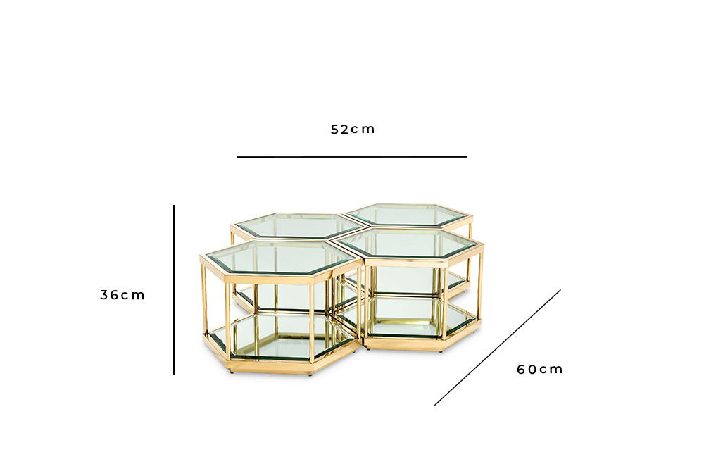 Inspiriert von der Struktur einer Bienenwabe, macht dieses verführerische Set aus 4 sechseckigen Sax Couchtischen Ihr Wohnzimmer zu einem Ort, an dem man sich gerne aufhält. Jeder Tisch verfügt über einen goldfarbenen Rahmen, eine klare Glasplatte und eine untere Ablage. Stellen Sie alle Tische zusammen, um ein großes Mittelstück zu schaffen, teilen Sie sie in Paare auf oder verwenden Sie sie separat als stilvolle Beistelltische.