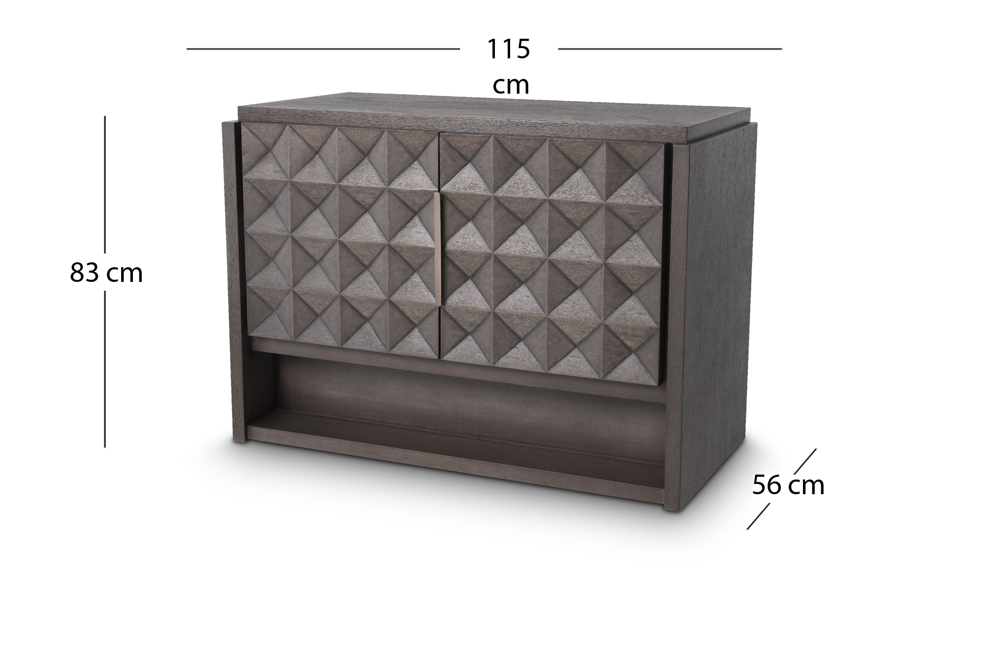 Mit ihren schönen Intarsien und den Griffen mit antikem Messingfinish verleiht die Kommode Jane L Ihrem Interieur eine moderne und dennoch zeitlose Ausstrahlung. Geometrische Muster aus massivem Merantiholz auf den Türverkleidungen erzeugen einen atemberaubenden 3D-Effekt.