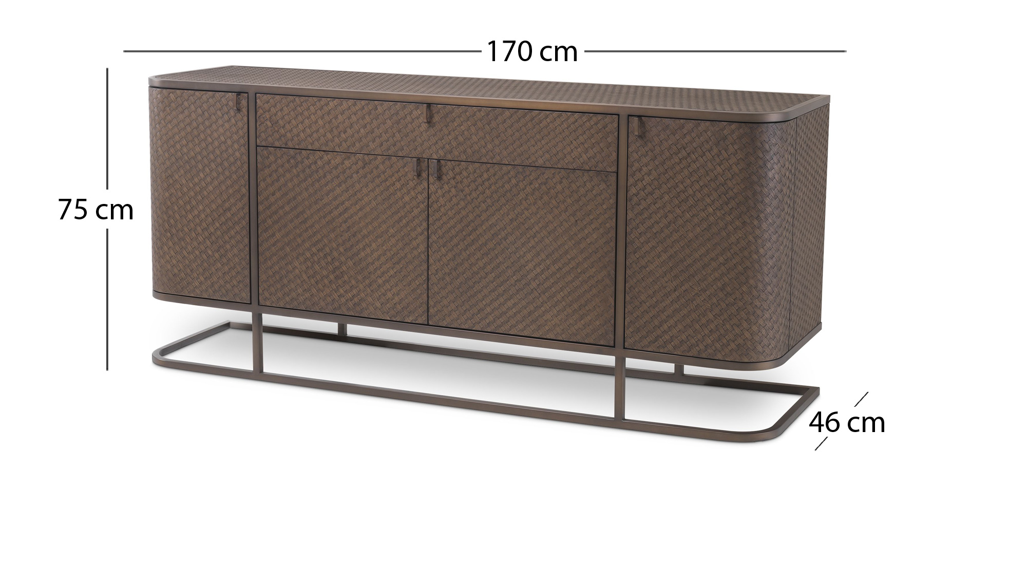 Alle Informationen auf einen BlickDie Napa Valley Bronze Kommode verbindet den Bauhaus-Stil mit einem Mid-Century Modern-Look, komplettiert durch einen schlanken Edelstahlrahmen. Sie ist mit geflochtenem Eichenfurnier ausgekleidet und enthält 4 Türen und eine Schublade mit Edelstahlgriff.