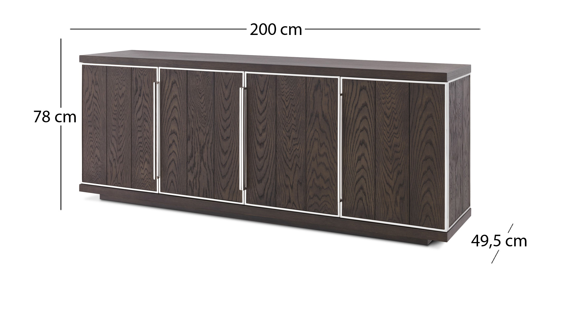Alle Informationen auf einen BlickBringen Sie mit der stilvollen Kommode Renzo einen eleganten Look in Ihr Wohnzimmer. Dieses stilvolle Sideboard, dessen Design der Mitte des 20. Jahrhunderts entspringt, besticht mit einem Finish in poliertem Nickel und bietet Ihnen hinter seinen 4 Türen eleganten Stauraum. Mit ihren natürlichen Holzmustern sind die mokkafarbenen Eichenfurniertüren ein echter Hingucker.
