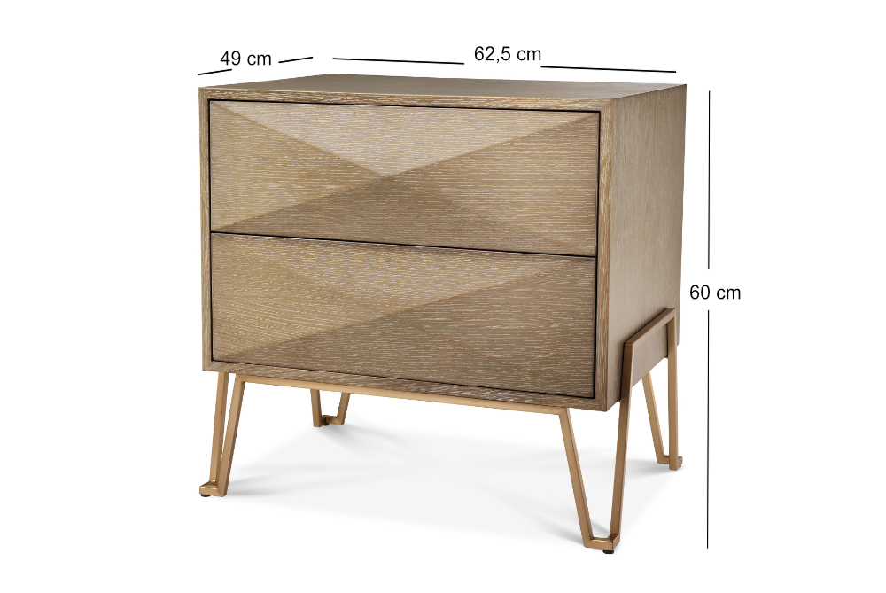 Alle Informationen auf einen BlickDer Nachttisch Highland von Eichholtz kombiniert einen messingfarbenen Rahmen aus gebürstetem Edelstahl mit gewaschenem Eichenfurnier. Die Schranktüren wirken mit ihren dreieckigen Silhouetten besonders edel.