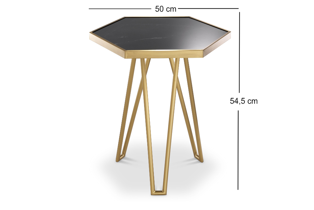 Alle Informationen auf einen BlickMit einer sechseckigen Tischplatte aus geschliffenem schwarzem Marmor und 3 Metallbeinen in gebürstetem Messing-Finish bietet der moderne Samson Beistelltisch einen minimalistischen Look, der zu jedem zeitgenössischen Interieur passt.