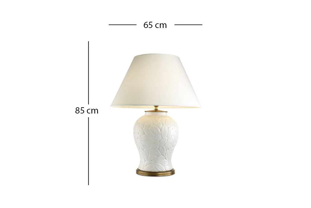 Der weiße Keramiksockel des Nachttischlampe Cyprus hat ein wunderbares Blattrelief und einen gerippten Rand mit antikem Messing-Finish. Sie wird mit einem weiß-cremefarbenen Lampenschirm geliefert.