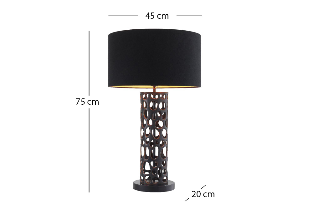 Alle Informationen auf einen BlickMit einem durchbrochenen Lampensockel mit bronzefarbenem Highlight-Finish ist die Tischlampe Dix perfekt, um Ihrem Schlafzimmer den letzten Schliff zu verleihen. Sie steht auf einem schicken schwarzen Marmorsockel und ist mit einem schwarzen Trommelschirm mit goldenem Innenfutter versehen.