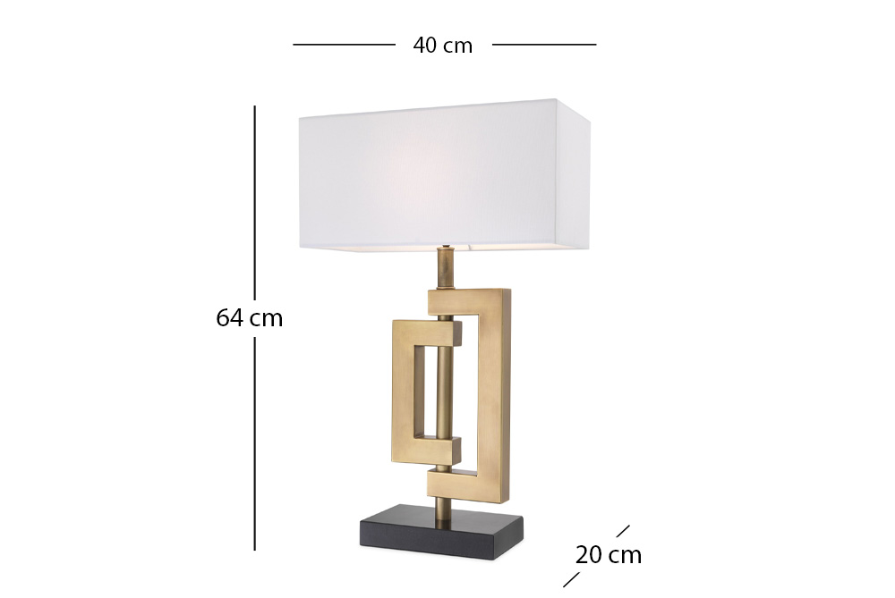 Diese zeitgenössische Leuchte besteht aus einem rechteckigen, schwarzen Granitsockel und einer Struktur mit einem zentralen Stiel und zwei Blöcken in einem antiken Messing-Finish. Sie wird mit einem rechteckigen weißen Lampenschirm geliefert.