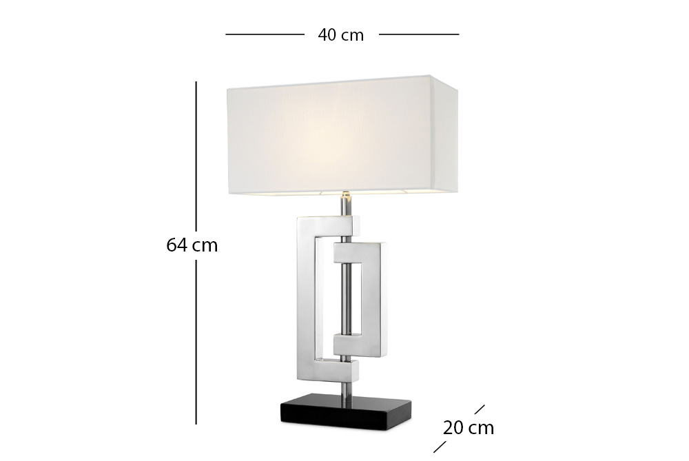 Diese zeitgenössische Leuchte besteht aus einem rechteckigen, schwarzen Granitsockel und einer Struktur mit einem zentralen Stiel und zwei aus poliertem Edelstahl gegossenen Blöcken. Sie wird mit einem rechteckigen weißen Lampenschirm geliefert.