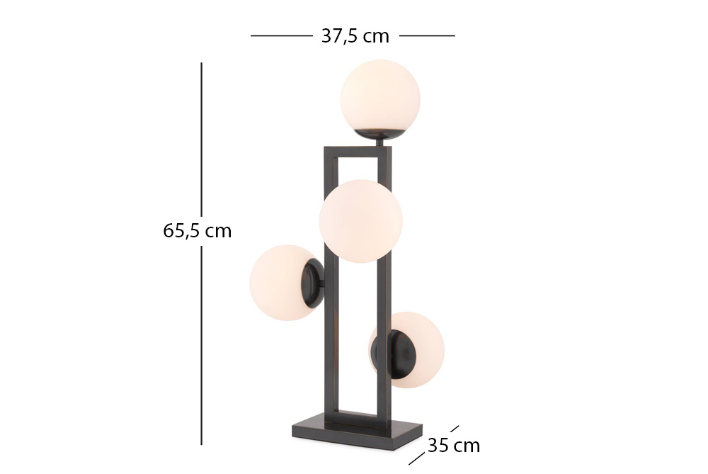 Alle Informationen auf einen BlickDie elegante Nachttischlampe Pascal besitzt einen schlanken rechteckigen Rahmen mit einem bronzefarbenen Finish. Die 4 weißen Glaskugeln verleihen dieser Lampe einen besonders eleganten Stil.