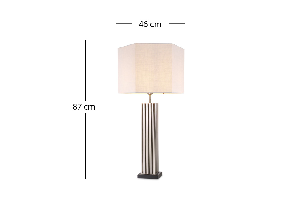 Alle Informationen auf einen BlickMit nicht weniger als 96 massiven quadratischen, antik-nickelfarbenen Röhren, die auf einem Marmorsockel montiert sind, ist die Tischlampe Viggo eine gewichtige Lampe mit einem einzigartigen Look. Sie wird mit einem sechseckigen weißen Stoffschirm geliefert, der die Form des Sockels perfekt ergänzt.